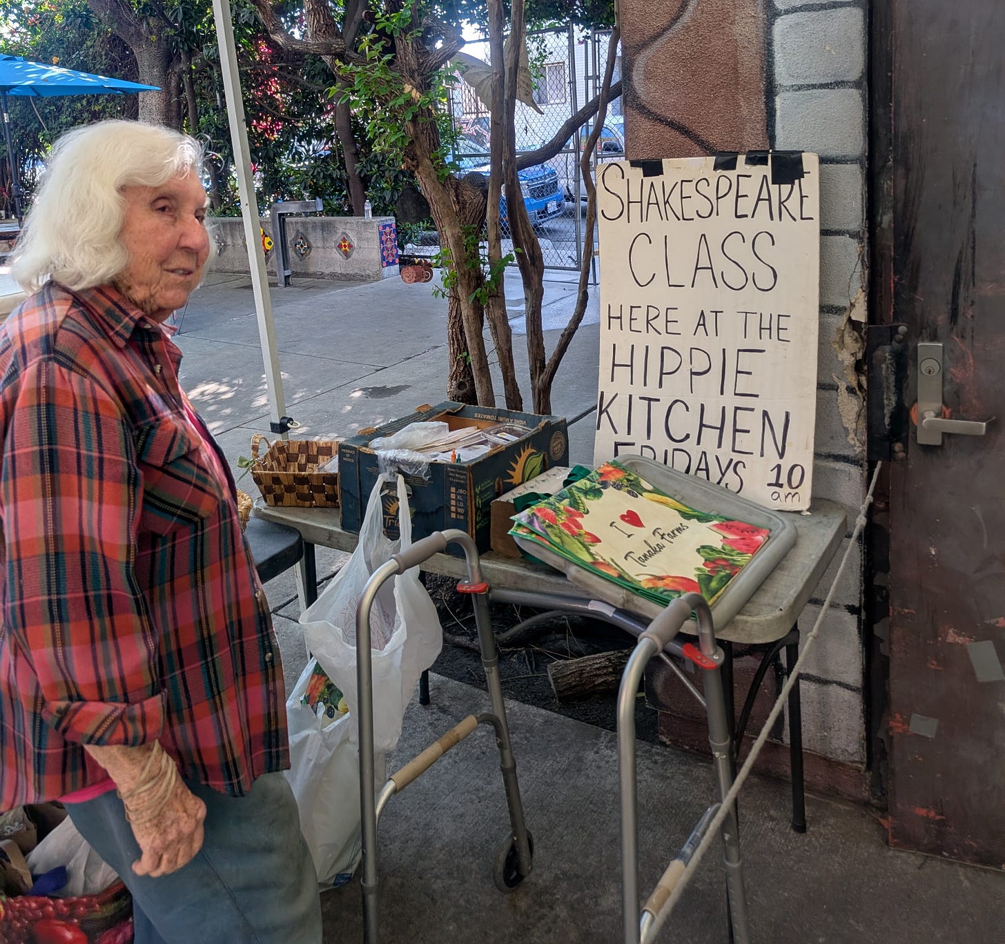 Aside from the fact that they love me and mine, which is really an honor, I love so much about the LACW and their ministry. I love that their house is painted the color of an Easter egg, that their meals may be broth or may be feasts, that they serve tea and offer Shakespeare classes in their soup kitchen. I love the smell of bleach mixed with the aroma of fresh flowers that makes the signature scent of their residence. I love their careful attention to hospice patients often cared for in their spare room, their ability to make the soup kitchen bean dish different and delicious each day, the fact that a conversation is always available around the cooking island while washing dishes. I love that their house is on a hill from which you can watch the sun rise and set and see the Hollywood sign and that people who’ve lived on the street share this view with people who’ve published books. I love that they have volunteers that they met while protesting Vietnam who still come to butter bread at the kitchen, that they have a signature artist who gives her art away and that you might discuss liturgy or you might discuss comic books over breakfast.