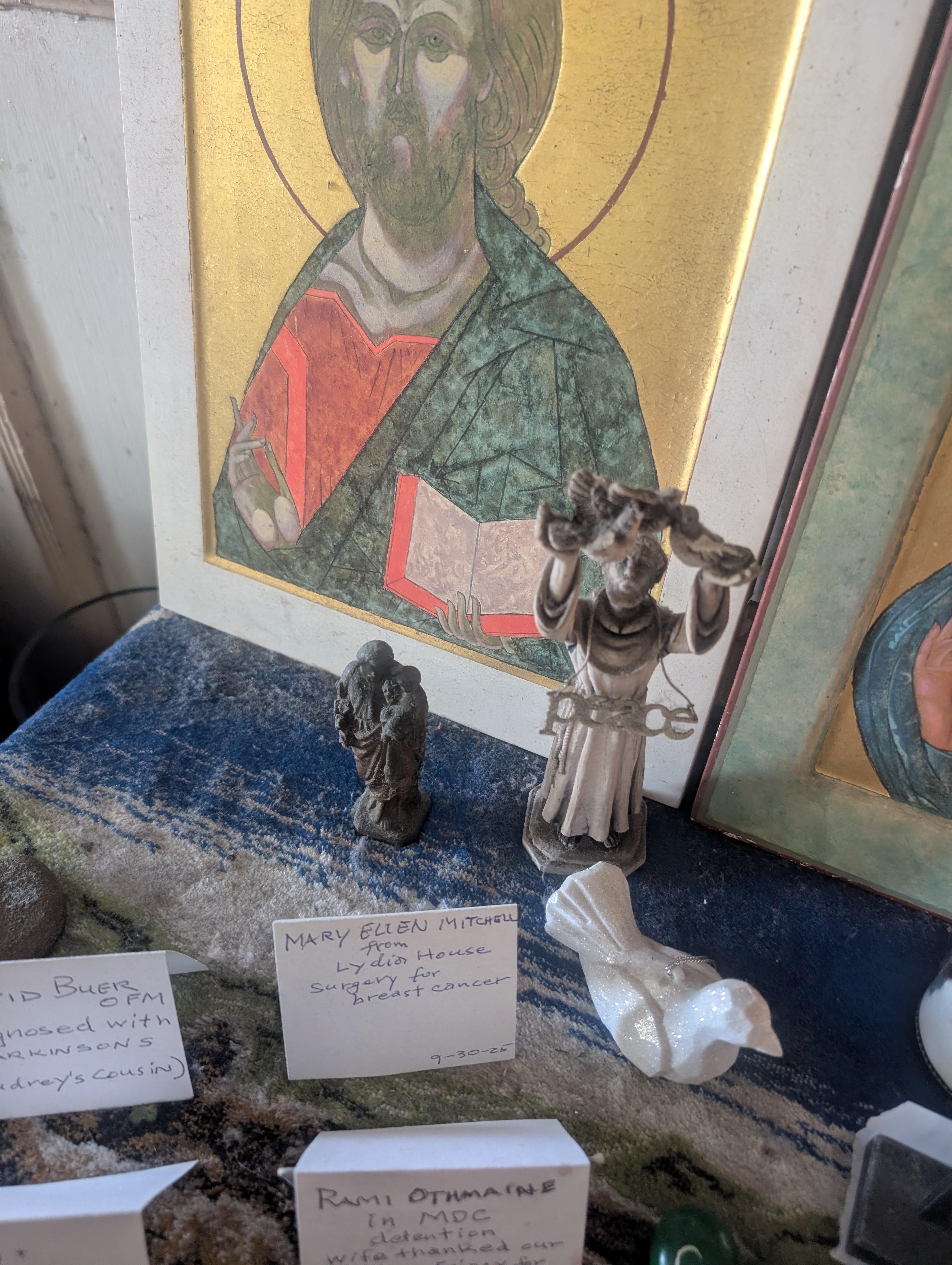 When we arrived last Thursday I was especially touched to find my name on their small altar and to learn from their matriarch, Catherine, that they have been praying for me. Those prayers come alongside their prayers that a homeless woman, Gypsy, find housing and that the mental health workers assigned to skid row would do their jobs, prayers to end war in Iran and that spiritual care would be allowed for immigrants in detention. Needless to say the LACW has plenty to pray for but they’ve joined a formidable crew of Christians that includes the Pentecostals of Arkansas and the Bruderhof of Pennsylvania in praying for me. (I have to say, should cancer take a turn for the worse, it will not be for lack of heaven being stormed from every theological angle.)